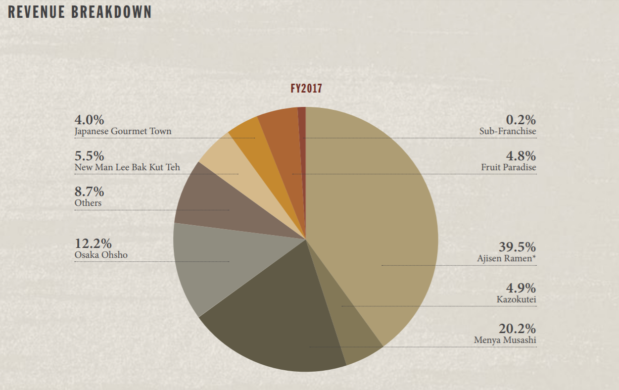 We may be familiar with the Ajisen Ramen brand, which accounts for the bulk of JFH’s revenue (39.5%). JFH also operates brands including Menya Musashi and Keika Ramen. It has operations in Singapore, Malaysia, Vietnam, Hong Kong and China.