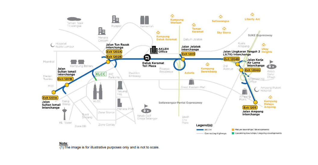 AKLEH is a 7.4km elevated highway, which connects Ampang to KLCC. Presently, its concession agreement will expire in 13+ years on 15 May 2037. It earns from 1 toll plaza – Datuk Keramat Toll Plaza. AKLEH’s traffic volume had reduced from 18.8 million in 2017 to 9.4 million in 2021 due to the COVID-19 pandemic. Since then, traffic volume had improved to 13.9 million in 2022.