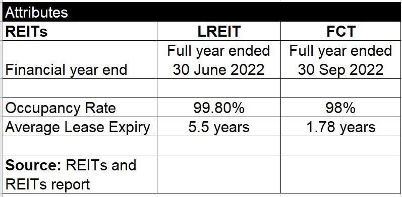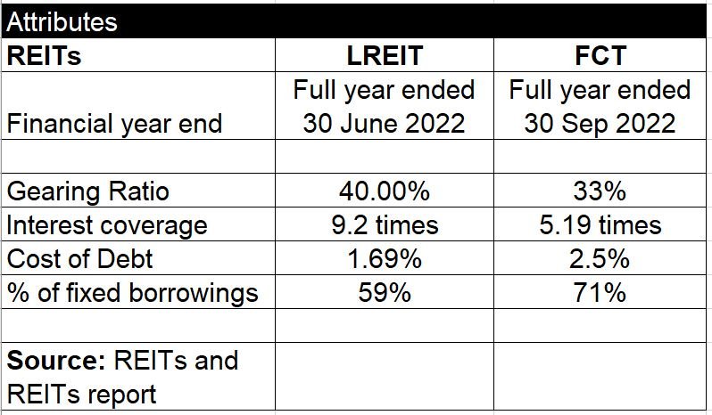 The table above shows that FCT has a lower gearing ratio of 33% versus LREIT’s 40%. Anything gearing 40% and above may signal a potential fund raising exercise which could be detrimental to shareholders.